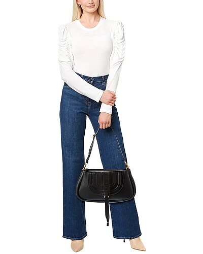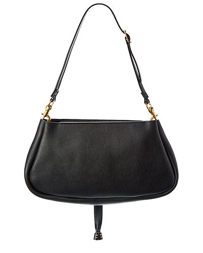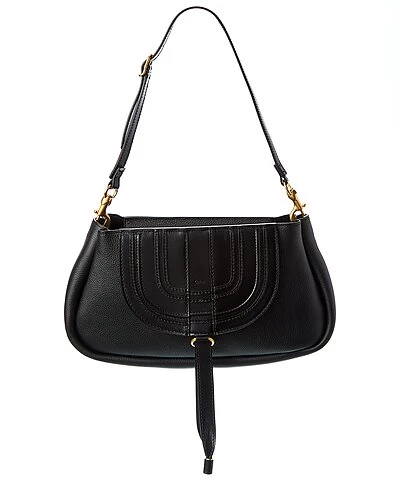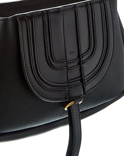 - Marcie Leather Clutch in black leather with gold-tone hardware and flap pocket