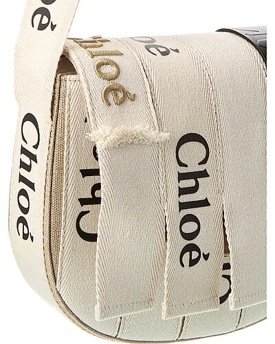 - Woody Canvas Shoulder Bag in beige canvas with gold-tone hardware and embroidered logo straps