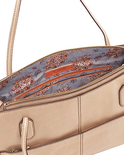 - Exterior design details: brushed antique brass hardware, front zip pocket, back wall cell pocket – perfect for your smartphone