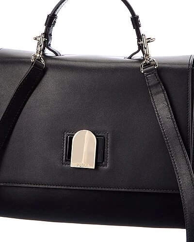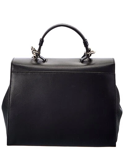 - Emma Small Top Handle Leather Satchel in nero leather and gold-tone hardware with exterior pocket