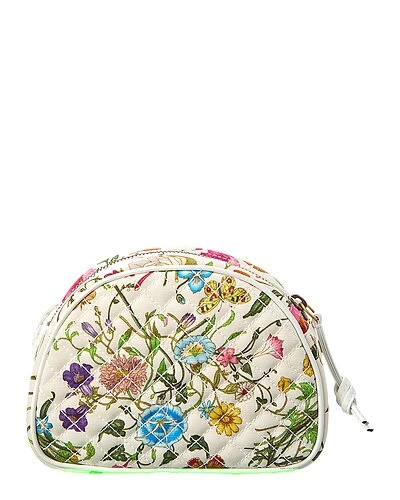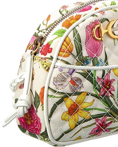 - Quilted Canvas Crossbody in white printed quilted canvas and light fine gold and dark silver hardware with interlocking G logo horsebit accent, exterior pocket and braided strap