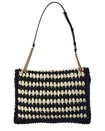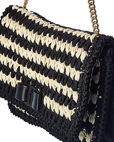 - Viva Bow Medium Crochet Shoulder Bag in black and white crochet cotton textile and gold-tone hardware with leather Vara bow accent