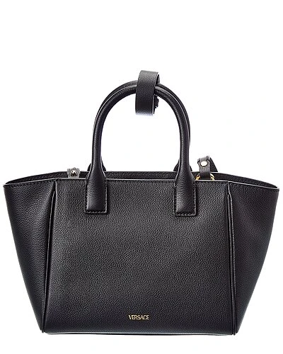- La Medusa Small Leather Tote in black leather and gold-tone hardware with Medusa head logo and chain accent
